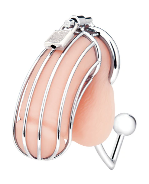 This silver cage embodies classic BDSM submission, featuring a solid metal sheath that completely surrounds the penis, firmly preventing any attempt at an erection. The set is made complete with a ring that secures around the testicles, restricting blood flow to heighten sensitivity and ensure that the final, denied orgasm is explosively intense.