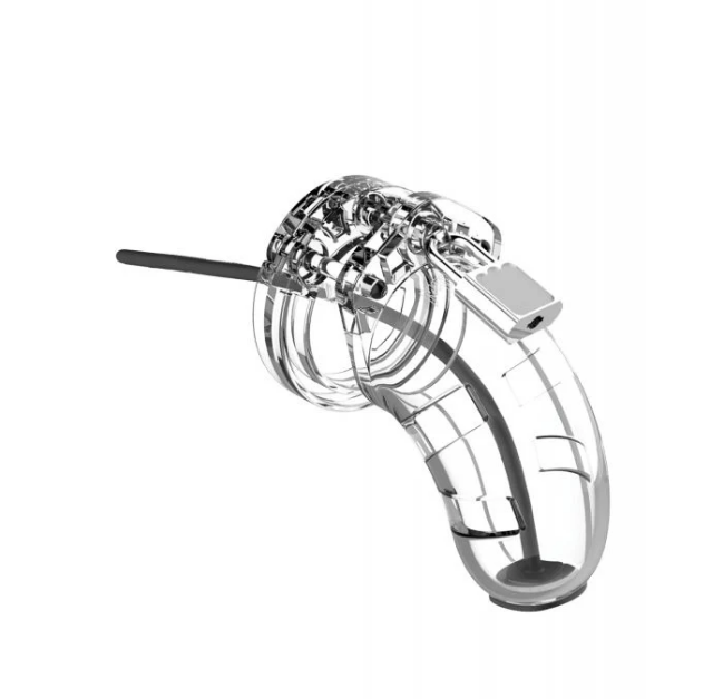 For the adventurous submissive, this Man Cage integrates a removable silicone urethral dilator (sounding rod) into the chastity device, combining restriction with internal urethral sensation. The clear polycarbonate cage is light and allows for visibility, while the smooth, medical-grade silicone dilator clicks into the bottom for a unique and intensely submissive experience.