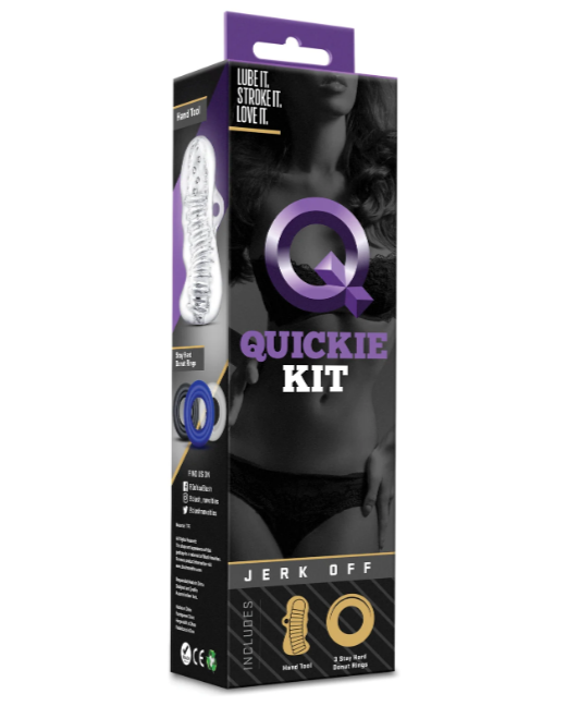 Enhance your enjoyment with the Quickie Kit - Jerk Off. Use the three cock rings to create extra pressure and increase stamina as you stroke your shaft with the sensuously soft sleeve. The ribbed inner channel of this bestselling, clear stroker heightens sensation during solo play—or have your lover watch you glide in and out....