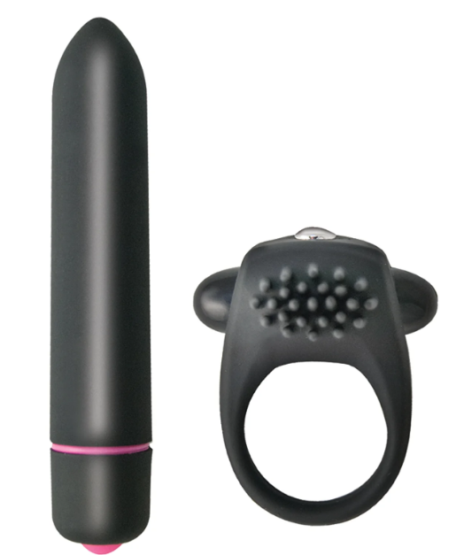 Get double the pleasure in one discreet, couples-friendly kit! This set includes a powerful 10-function bullet vibrator and a silicone vibrating cockring. The cockring adds support and external stimulation, while the bullet is perfect for targeted clitoral or body play. Both pieces are discreetly quiet and completely waterproof for added fun. Made from body-safe materials (ABS bullet, silicone ring) and fully phthalate-free, this kit is ready to elevate your partnered pleasure right out of the box with batteries included!