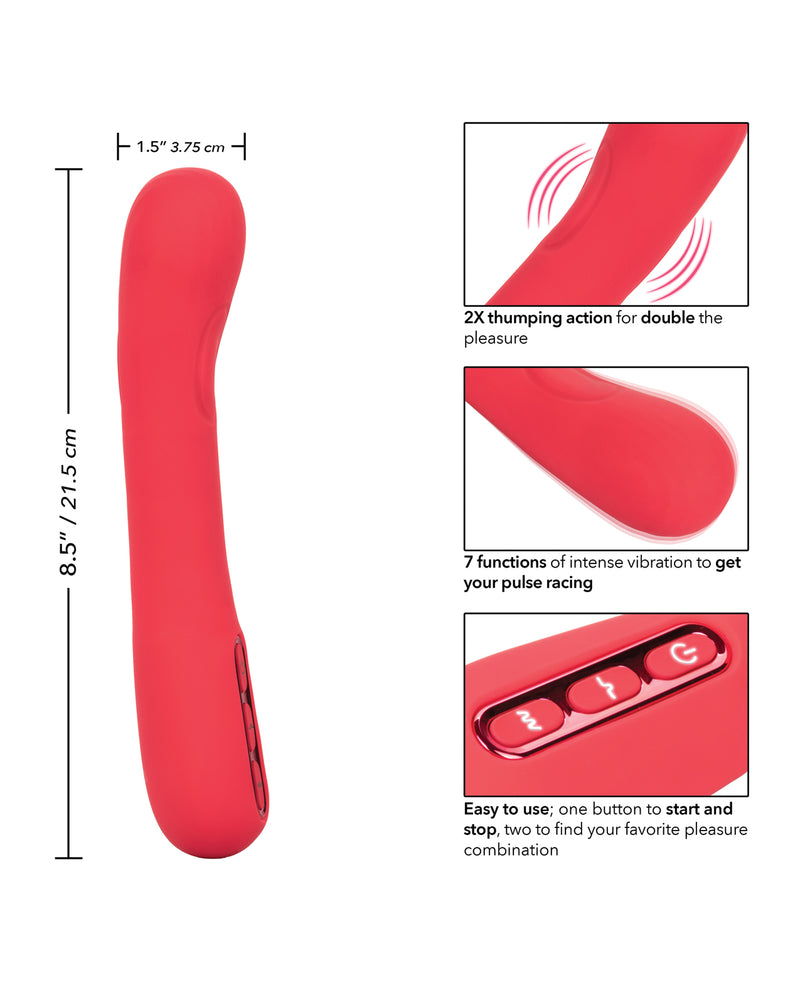 With 2 times the powerful thumping action, the thrilling Throb Thumper is made to get your pulse racing. This powerful massager has 2 uniquely placed thumping pads on both sides of the shaft to deliver deep, rumbling thumping. Embrace fully personalized pleasure with independently controlled 3 speeds of thrilling thumping action and 7 intense functions of vibration. The pulsating curved tip delivers 3 thrilling speeds of thumping sensation that redefine pleasure. The easy-touch 3-button control lets you cycle through the knee-shaking settings. Recharge the premium silicone vibrator in 2 hours with the provided USB charging cable to enjoy 60 minutes of high-speed stimulation or 80 minutes of low speed vibrations. The self-sealing charging port and silicone body let you get steamy with this waterproof vibe. The hypoallergenic premium silicone is body safe, unscented and phthalate free to keep you most sensitive spots, happy and healthy.