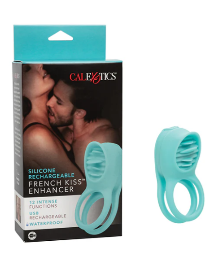 Spice up your love life with the French Kiss Enhancer, designed to multiply pleasure for both partners! This stretchy silicone dual ring works to enhance his stamina and girth, making the experience more powerful for him, while the flickering teaser ring sends electrifying vibrations to her most sensitive sweet spots. It boasts 12 functions of powerful vibration and a memory chip that remembers your favorite setting. Best of all, it's 100% waterproof for steamy bath or shower sessions, recharging fully in just one hour for up to an hour of fun.