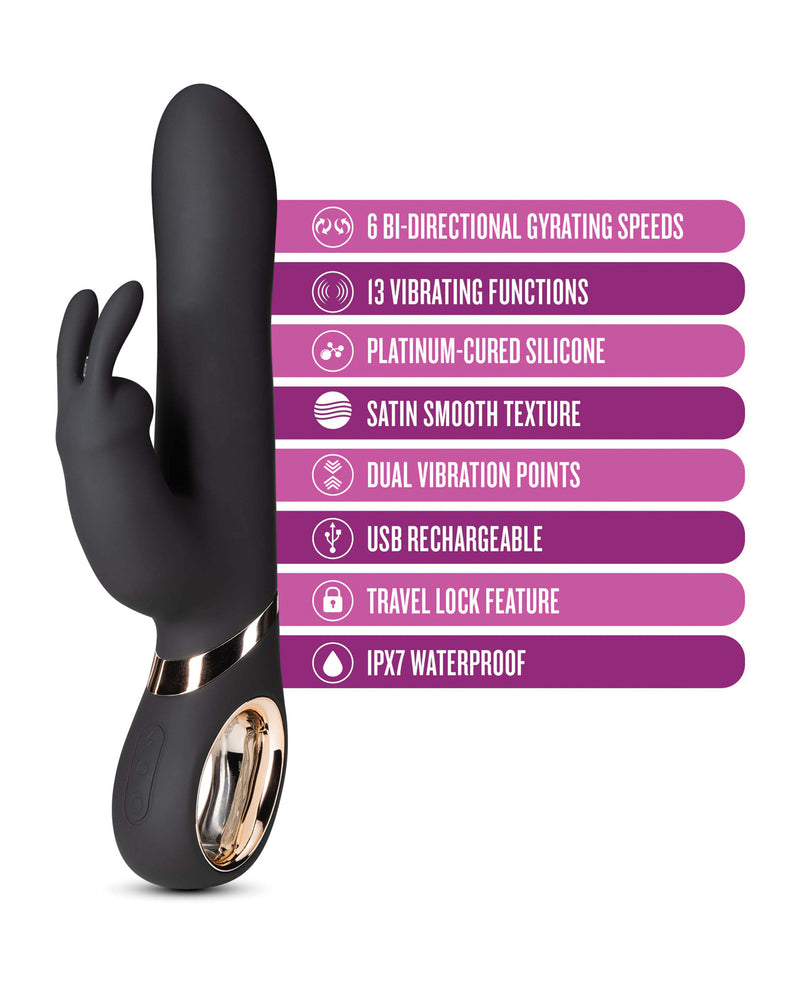 Live lushly! Victoria is a gyrating rabbit with 3 powerful motors ready to deliver pleasure. There are 6 gyrating functions that are reversible as desired for optimal G-spot stimulation, and 13 powerful vibration functions to choose from! Victoria also has a travel lock function so you can take it anywhere with you. This USB rechargeable rabbit is IPX7 waterproof for easy cleaning and bath or shower play! Made of platinum cured Silicone and satin smooth. Victoria is body-safe, phthalate-free, latex free and ready to delight.