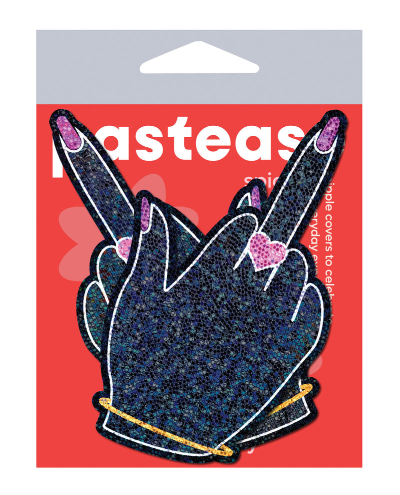 Middle Finger Pasties: Glittering F*ck You Lady Hands Nipple Covers by Pastease® Hand-made in the USA of soft form-fitting material that forms seamlessly to curves and resists wrinkling over hardening nipples. Just peel-and-stick on clean, dry skin.