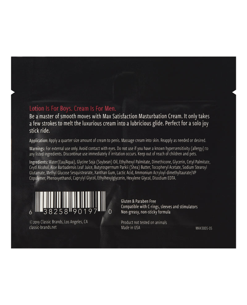 Be a master of smooth moves with MAX SATISFACTION Masturbation Cream. It only takes a few strokes to melt the luxurious cream into a lubricious glide. Perfect for a solo joy stick ride. Goes on as a cream, melts into a slick glide. Long-lasting performance without stickiness. Compatible with rings, sleeves and stimulators. Pack of 24 6 ml foils.