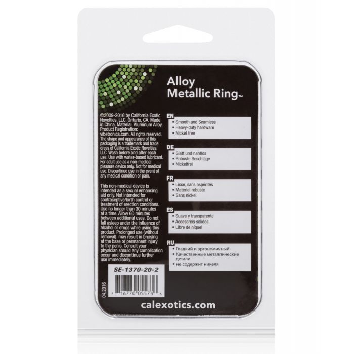 Extend your intimate, exotic play with the Alloy Metallic Ring. The large size metallic band is designed to provide comfortable enhancement support, while increasing sensitivity and mind-blowing sensations. The smooth, sleek and seamless metal ring is ideal for the first time and experienced users who want to experiment with seduction control, and to experience heightened sensual pleasure. Slip the ring on, over the erect penis, and enjoy unforgettable orgasmic encounters.