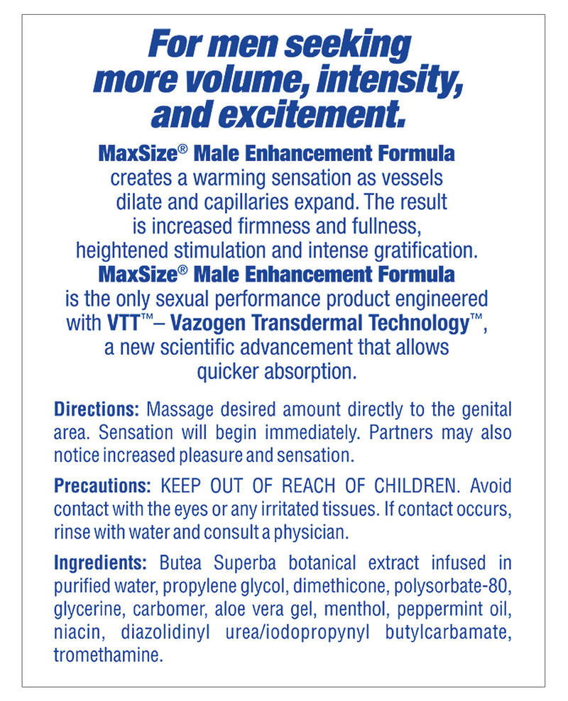 Swiss Navy Max Size Cream is a male enhancement topical formula that provides a unique transdermal delivery system for quick absorption and immediate results. Swiss Navy Max Size Cream is the only topical male enhancement product with Butea Superba, a well-documented and patented natural PDE-5 inhibitor. This natural herb is only now coming to the U.S. after years of research in Thailand. Swiss Navy Max Size Cream is a natural male enhancement product that will significantly dilate blood vessels and capillaries. In clinical trials, users report increased sexual stamina and male enhancement without any side effects. Users convey a distinct sensation of pleasure and enhancement within moments of application. Swiss Navy Max Size Cream is formulated in a lubricating Vazogen Transdermal Gel, is not oily or greasy and may be enjoyed during sex by both partners, male and female. Swiss Navy Max Size Cream may be used by those who have medical conditions that prevent them from using ingestibles. Swiss Navy Max Size Cream provides optimal male enhancement when used regularly over time and especially when used in conjunction with Swiss Navy Max Size oral digestible formula.