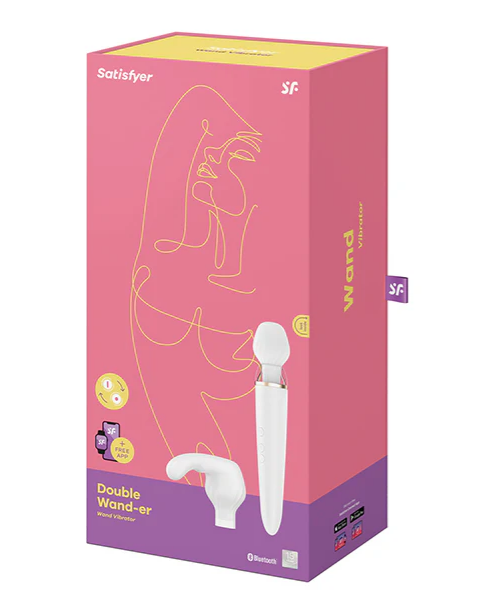 Double Wand-er är en XXL-massager som levereras med utbytbara tillbehör. Den kan vara en klassisk wand eller, med ett snabbt byte, en böjd G-punktsvibrator. Dess massiva storlek och appkontroll gör den till en av de mest mångsidiga "lyxiga" leksakerna i den vita kollektionen.