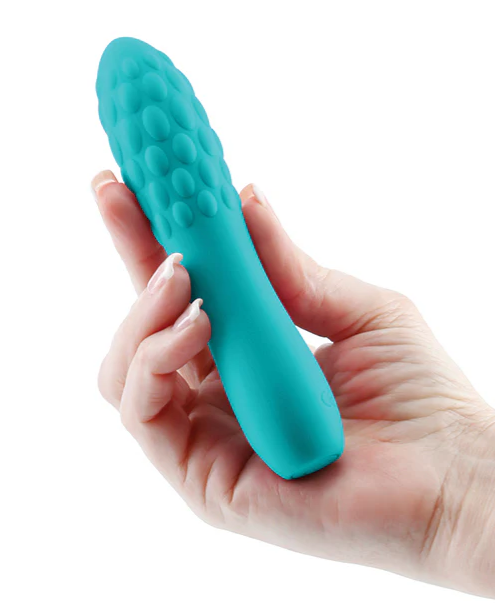 Möt Rita, en trendig teal vibrator som är lika rolig att titta på som att använda. Hennes texturerade yta ger dig den extra stimulansen precis där du vill ha den, allt insvept i silkeslen platina-silikon. Eftersom hon är laddningsbar och vattentät är hon alltid redo för ett äventyr, vare sig det är i sovrummet eller i duschen.